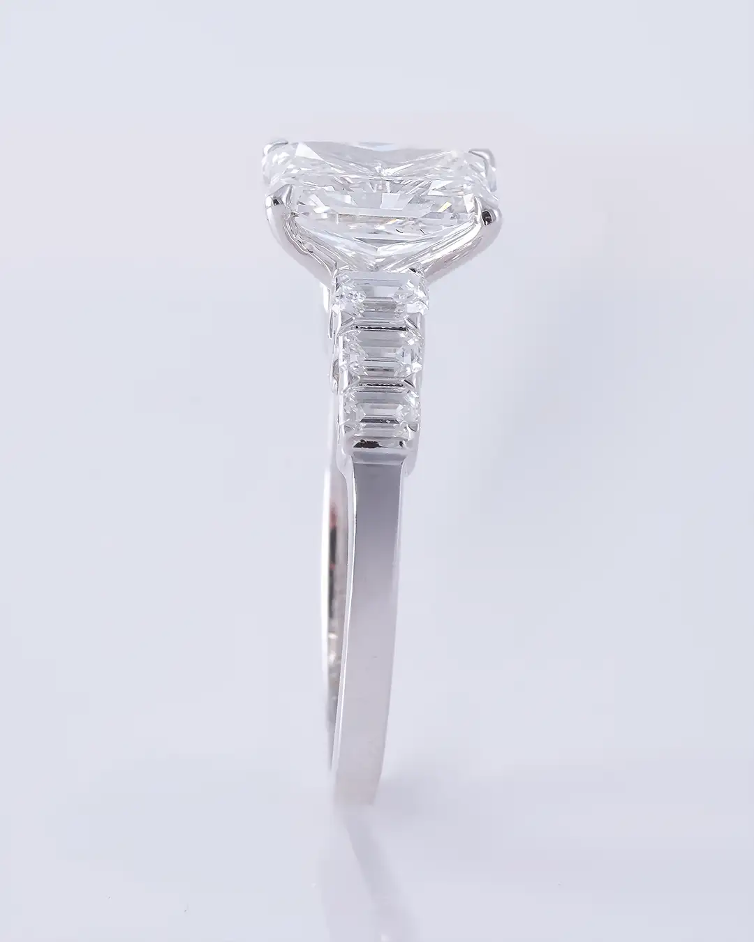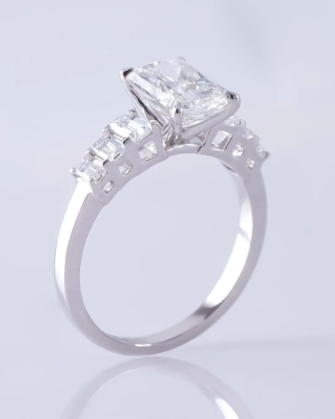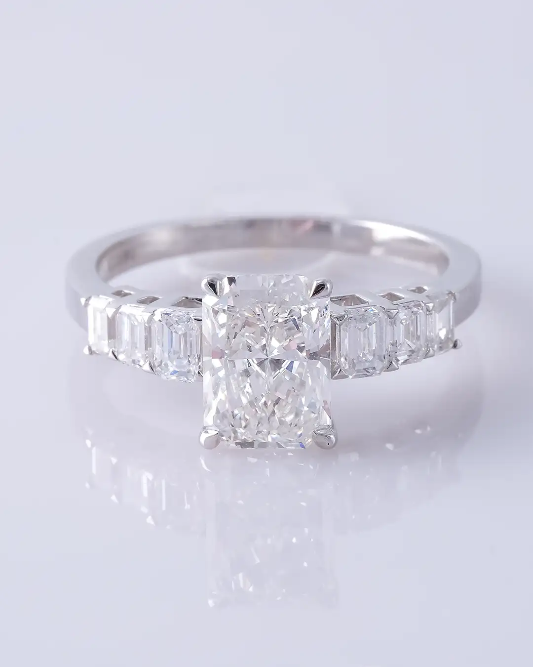 A radiant-cut diamond ring with emerald-cut side stones, featuring lab-grown 2.66 carat diamonds in an 18K Italian white gold setting.